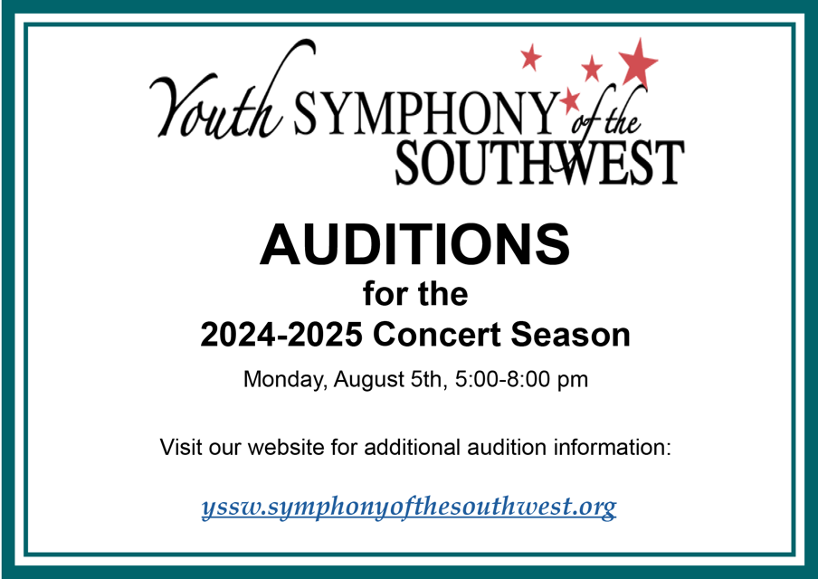 Youth Symphony of the Southwest will be holding auditions for string players for the 2024-2025 season on August 5, 2024 . The auditions will be held from 5:00 pm - 8:00 pm, by appointment, at the Chandler High School Band Room (350 No. Arizona Ave, Chandler, AZ 85225).